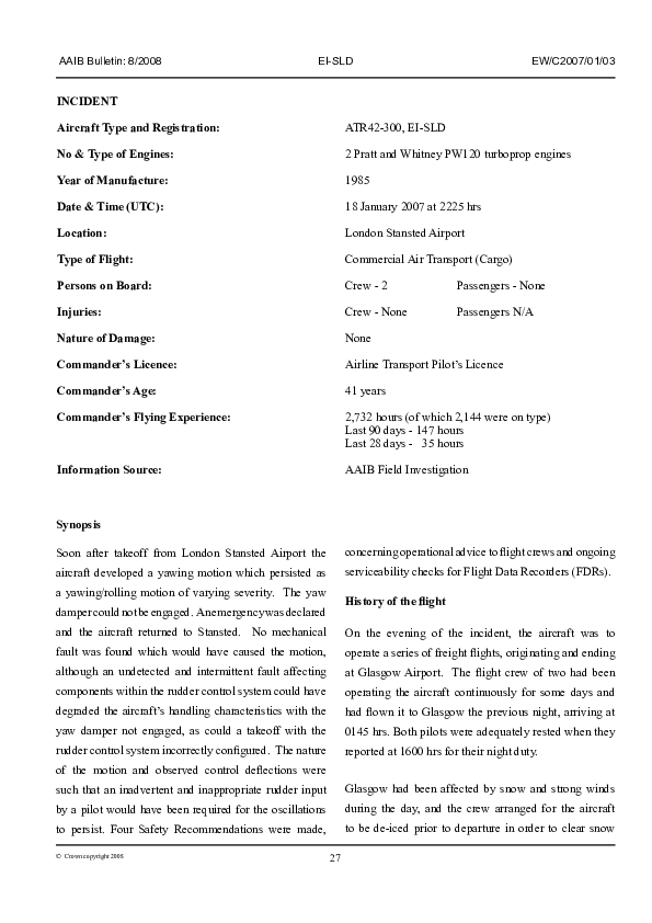 AAIB Bulletin 8/2008 EW/C2007/01/03: ATR 42-300, EI_SLD, Stansted Airport, 18 Jan 2007