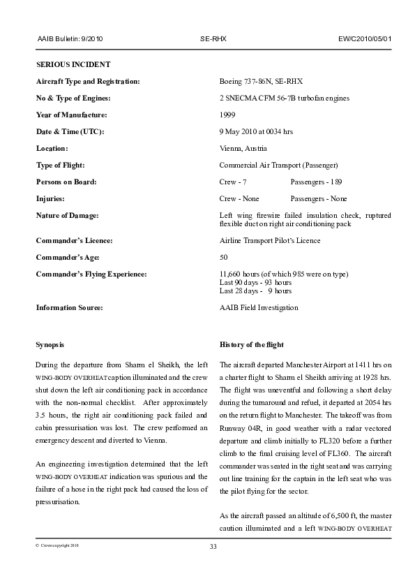 AAIB Bulletin 9/2010 EW/C2010/05/01, Boeing 737-86N, SE-RHX, Vienna Austria, 9 May 2010