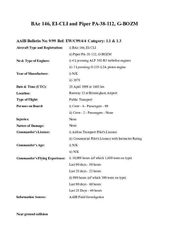AAIB Bulletin 9/99 EW/C99/4/4, BAe 146, EI-CLI / Piper PA-38-112, G-BOZM, Birmingham UK, 28 Apr 1999