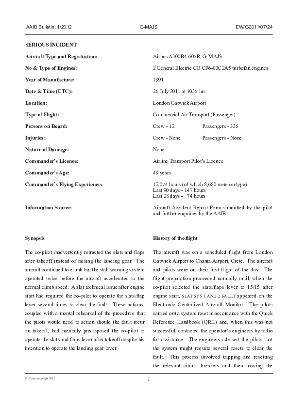 AAIB Bulletin1/2012 EW/G2011/07/24, Airbus A300B4-605R, G-MAJS, Gatwick, 26 Jul 2011