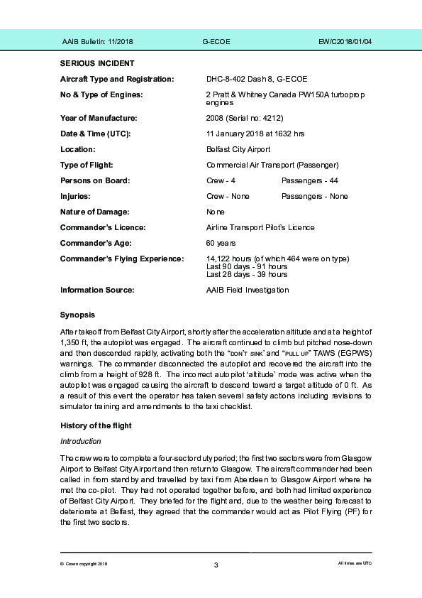 AAIB Bulleting 11/2018 DH8D (G-ECOE) vicinity Belfast City UK, 11 Jan 2018
