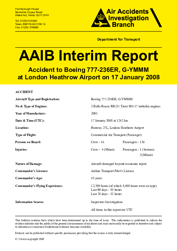 AAIB Interim Report, Boeing 777-236ER, G-YMMM, Heathrow, 17 Jan 2008