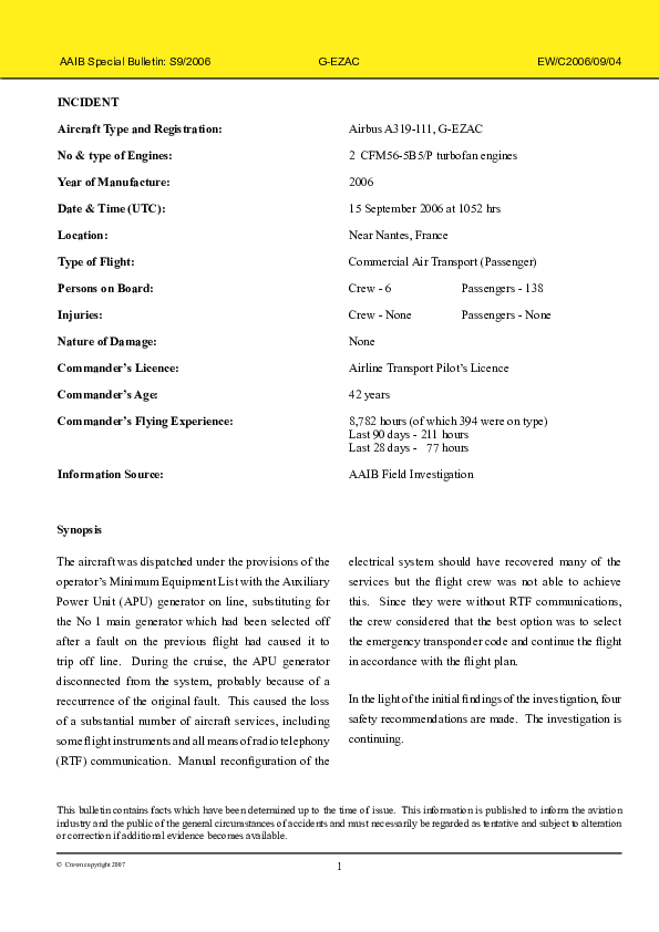 AAIB Special Bulletin S9/2006 EW/C2006/09/04, Airbus A319-111, G-EZAC, near Nantes France, 15 Sep 20