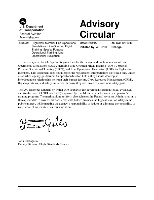 Subject: Flightcrew Member Line Operational Simulations: Line-Oriented Flight Training, Special Purpose Operational Training, Line Operational Evaluation This advisory circular (AC) presents guidelines for the design and implementation of Line Operational Simulations (LOS), including Line-Oriented Flight Training (LOFT), Special Purpose Operational Training (SPOT), and Line Operational Evaluation (LOE) for flightcrew members. This document does not interpret the regulations; interpretations are issued only under established agency guidelines. As operators develop LOSs, they should develop an interdependent relationship between their human factors, Crew Resource Management (CRM), flight operations, and safety initiatives, because they are linked to a common safety goal. This AC describes a means by which LOS scenarios are developed, scripted, tested, evaluated, and (in the case of LOFT and LOE) approved by the Administrator for use in an operator's training program. The methodology set forth also achieves the Federal Aviation Administration's (FAA) mandate to ensure that each certificate holder provides the highest level of safety in the public interest, while meeting the agency's responsibility to reduce or eliminate the possibility or recurrence of accidents in air transportation.