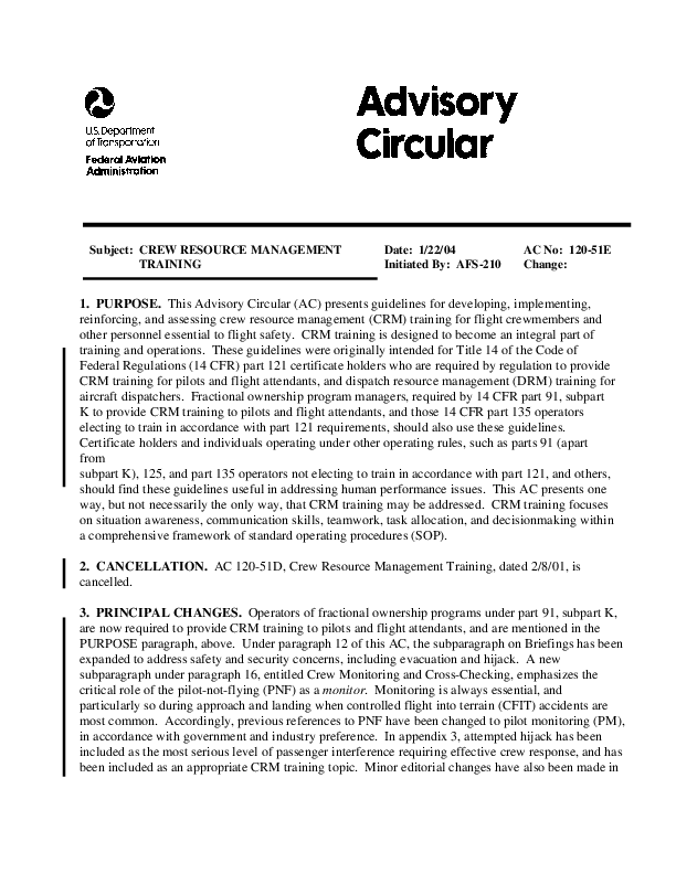 This Advisory Circular (AC) presents guidelines for developing, implementing, reinforcing, and assessing crew resource management (CRM) training for flight crewmembers and other personnel essential to flight safety.