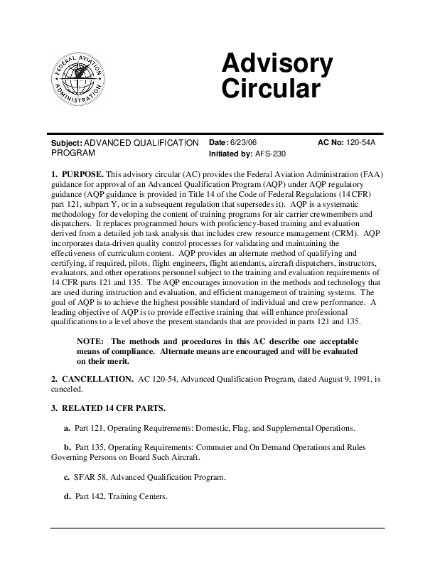 This advisory circular (AC) provides the Federal Aviation Administration (FAA) guidance for approval of an Advanced Qualification Program (AQP)