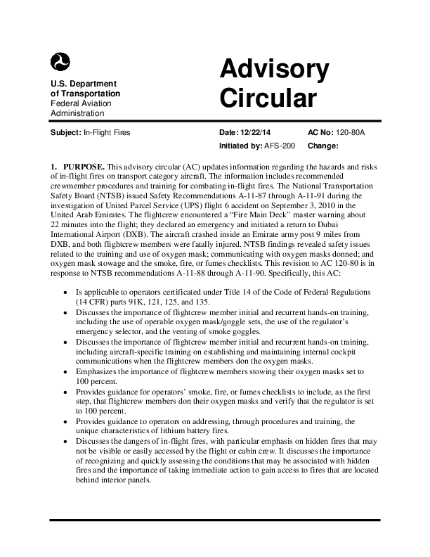 Advisory Circular discusses the dangers of in-flight fires and provides guidance on how to deal with them.
