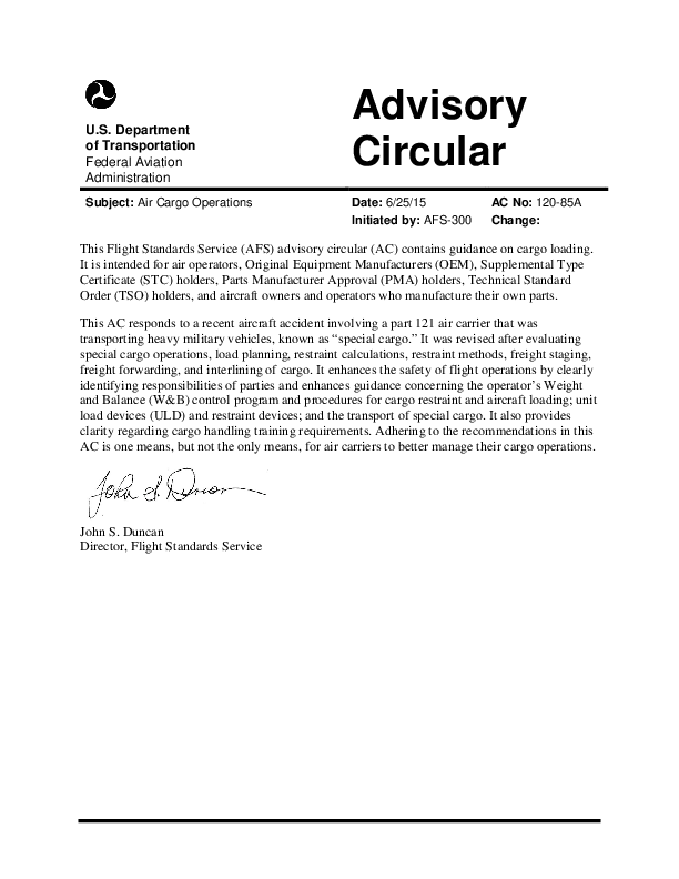 This Flight Standards Service (AFS) advisory circular (AC) contains guidance on cargo loading. It is intended for air operators, Original Equipment Manufacturers (OEM), Supplemental Type Certificate (STC) holders, Parts Manufacturer Approval (PMA) holders, Technical Standard Order (TSO) holders, and aircraft owners and operators who manufacture their own parts. This AC responds to a recent aircraft accident involving a part 121 air carrier that was transporting heavy military vehicles, known as special cargo. It was revised after evaluating special cargo operations, load planning, restraint calculations, restraint methods, freight staging, freight forwarding, and interlining of cargo. It enhances the safety of flight operations by clearly identifying responsibilities of parties and enhances guidance concerning the operator's Weight and Balance (W&B) control program and procedures for cargo restraint and aircraft loading; unit load devices (ULD) and restraint devices; and the transport of special cargo. It also provides clarity regarding cargo handling training requirements. Adhering to the recommendations in this AC is one means, but not the only means, for air carriers to better manage their cargo operations.