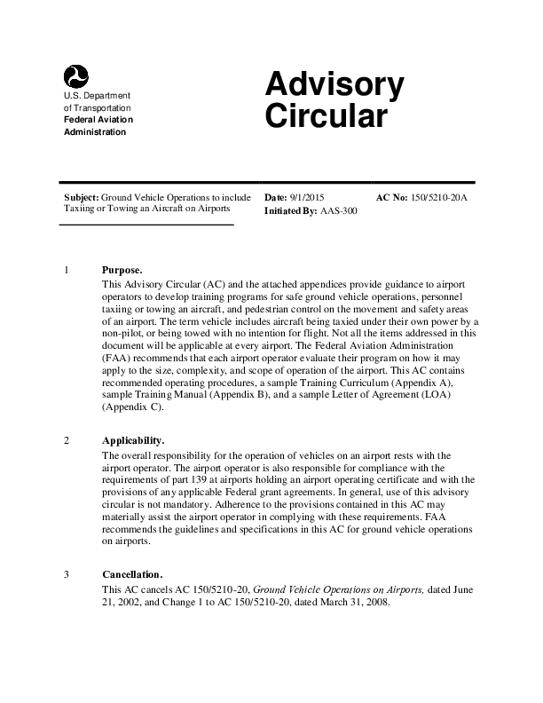 AC 150/5210-20A : Ground Vehicle Operations to include Taxiing or Towing an Aircraft on Airports
