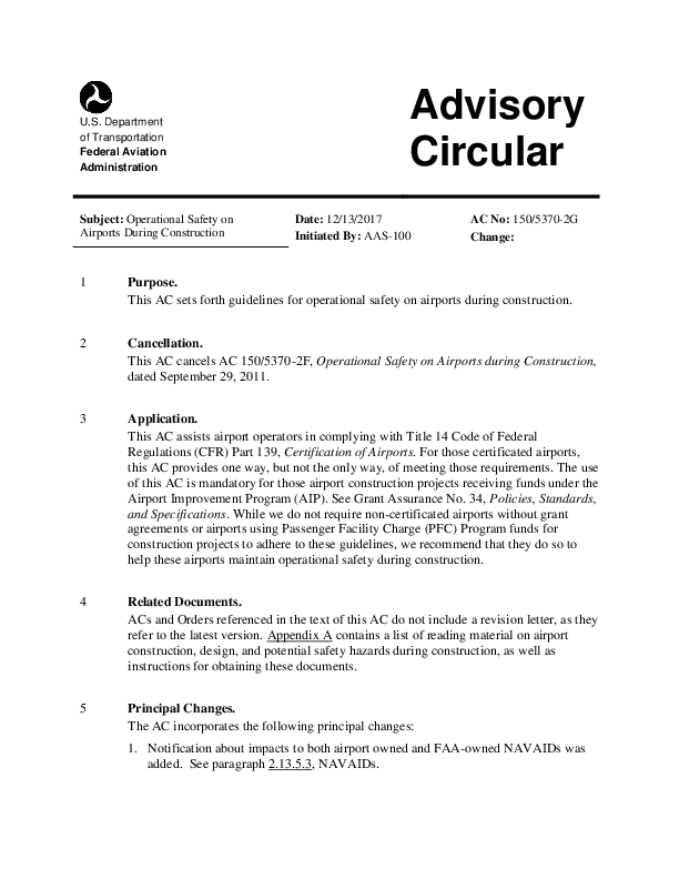 This AC sets forth guidelines for operational safety on airports during construction. This AC cancels AC 150/5370-2F, Operational Safety on Airports during Construction, dated September 29, 2011.
