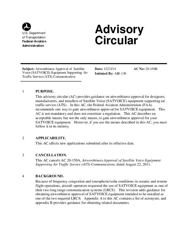 This advisory circular (AC) provides guidance on airworthiness approval for designers, manufacturers, and installers of Satellite Voice (SATVOICE) equipment supporting air traffic service (ATS). In this AC, the Federal Aviation Administration (FAA) recommends one way to gain airworthiness approval for SATVOICE equipment. This AC is not mandatory and does not constitute a regulation. This AC describes an acceptable means, but not the only means, to gain airworthiness approval for your SATVOICE equipment. However, if you use the means described in this AC, you must follow it in its entirety.