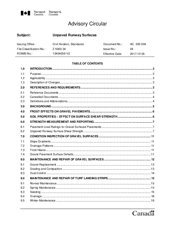 The purpose of this document is to outline methodologies for the measurement and reporting of surface shear strength for unpaved runways. In addition, the document outlines recommended practices for condition inspection, maintenance and repair of airport gravel surfaces and turf landing strips.