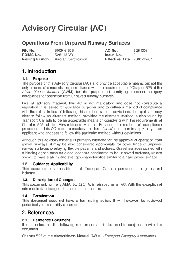 The purpose of this Advisory Circular (AC) is to provide acceptable means, but not the only means, of demonstrating compliance with the requirements of Chapter 525 of the Airworthiness Manual (AWM) for the purpose of certifying transport category aeroplanes for operation from unpaved runway surfaces.