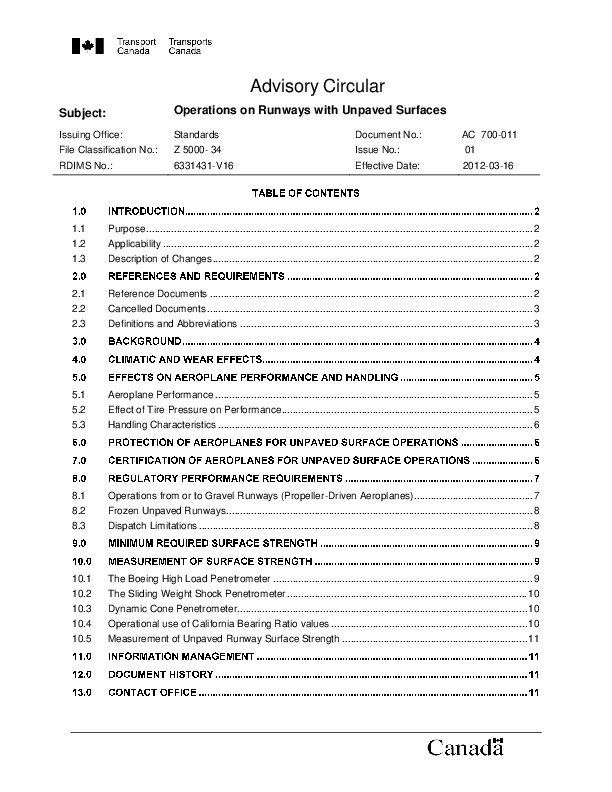 The purpose of this document is to provide guidance to air operators for the safe operations of aeroplanes on runways with unpaved surfaces in accordance with the applicable Canadian Aviation Regulations (CARs) and Standards.