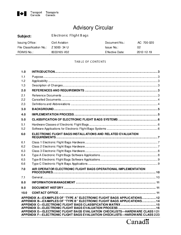 This Advisory Circular (AC) is provided for information and guidance purposes. It may describe an example of an acceptable means, but not the only means, of demonstrating compliance with regulations and standards. This AC on its own does not change, create, amend or permit deviations from regulatory requirements, nor does it establish minimum standards.