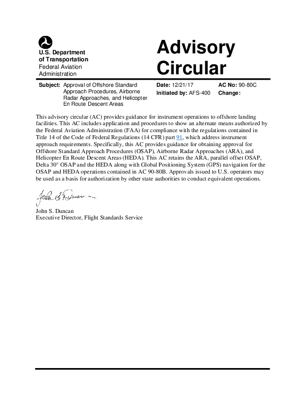 This advisory circular provides guidance for instrument operations to offshore landing facilities. It provides guidance for obtaining approval for Offshore Standard Approach Procedures (OSAP), Airborne Radar Approaches (ARA), and Helicopter En Route Descent Areas (HEDA).