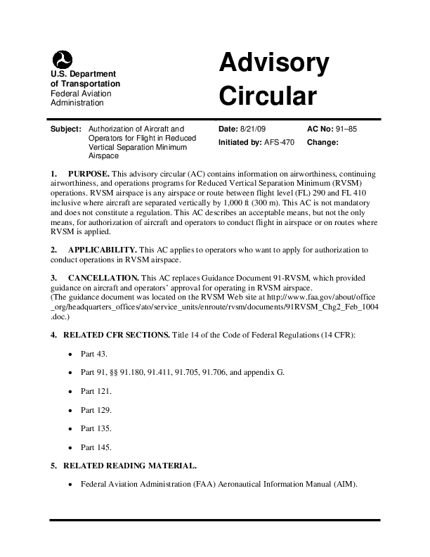 AC 91-85 Authorization of Aircraft and Operators for Flight in RVSM Airspace