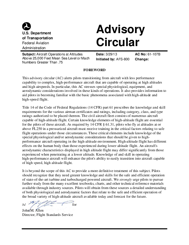 AC No: 61-107BAircraft Operations at Altitudes Above 25,000 Feet Mean Sea Level or Mach Numbers Grea