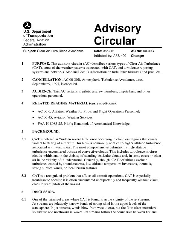 This Advisory Circular (AC) describes to pilots, aircrew members, dispatchers, and other operations personnel the various types of clear air turbulence (CAT) and some of the weather patterns associated with it.