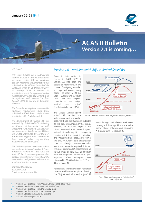 This special issue of ACAS II Bulletin focuses on a forthcoming change to TCAS II, the introduction of the new version 7.1. A regulatory decision (European Commission Implementing Rule) regarding implementation was published on 20 December 2011: all existing TCAS II version 7.0 installations must be upgraded before 1 December 2015 and new aircraft must be equipped with version 7.1 from 1 March 2012 to operate in European airspace. The EU Implementing Rule sets an earlier equipage requirements than those published in ICAO Annex 10 (1 January 2014 new installations, 1 January 2017 existing units).