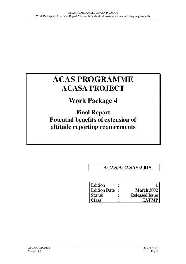 WP4 addresses the issue of the tangible safety benefits that a proposed “Mode C reporting mandate will bring. Mandatory altitude reporting is envisaged for general aviation (GA) aircraft after about January 2006. The benefits to be quantified relate to the expectation that more potential conflicts between TCAS equipped aircraft and GA aircraft will be detected and avoided as a direct consequence of mandatory altitude reporting.