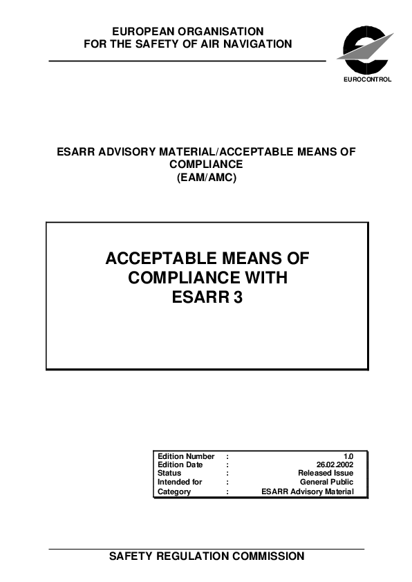 This document is intended to present the acceptable means of compliance (AMC) recognised by SRC as possible harmonised ways to meet ESARR 3 provisions within the ECAC region.