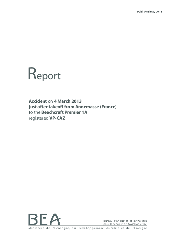 On 4 March 2013, a Beechcraft Premier 1A stalled and crashed soon after take off from Annemasse. The Investigation concluded that the stall and subsequent loss of control was attributable to frozen deposits on the wings which the professional pilot flying the privately-operated aircraft had either not been aware of or had considered insignificant. It was noted that the aircraft had been parked outside overnight and that conditions had favoured frost formation. The presence of a substantial quantity of cold-soaked fuel had favoured frost formation. The presence of a substantial quantity of cold-soaked fuel in the wing tanks overnight was also noted.
