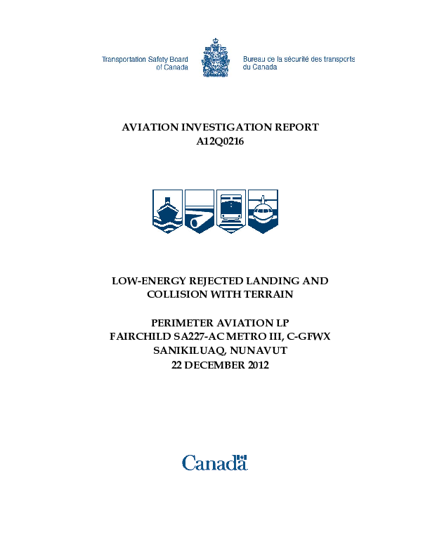 On 22 December 2012, the Perimeter Aviation LP, Fairchild SA227-AC Metro III (registration C-GFWX, serial number AC650B), operating as Perimeter flight PAG993, departed Winnipeg/James Armstrong Richardson International Airport, Manitoba, at 1939 Coordinated Universal Time (1339 Central Standard Time) as a charter flight to Sanikiluaq, Nunavut. Following an attempted visual approach to Runway 09, a nonprecision non-directional beacon (NDB) Runway 27 approach was conducted. Visual contact with the runway environment was made and a circling for Runway 09 initiated. Visual contact with the Runway 09 environment was lost and a return to the Sanikiluaq NDB was executed. A second NDB Runway 27 approach was conducted with the intent to land on Runway 27. Visual contact with the runway environment was made after passing the missed approach point. Following a steep descent, a rejected landing was initiated at 20 to 50 feet above the runway; the aircraft struck the ground approximately 525 feet beyond the departure end of Runway 27. The 406 MHz emergency locator transmitter activated on impact. The 2 flight crew and 1 passenger sustained serious injuries, 5 passengers sustained minor injuries, and 1 infant was fatally injured. Occupants exited the aircraft via the forward right overwing exit and were immediately transported to the local health centre. The aircraft was destroyed. The occurrence took place during the hours of darkness at 2306 Coordinated Universal Time (1806 Eastern Standard Time).