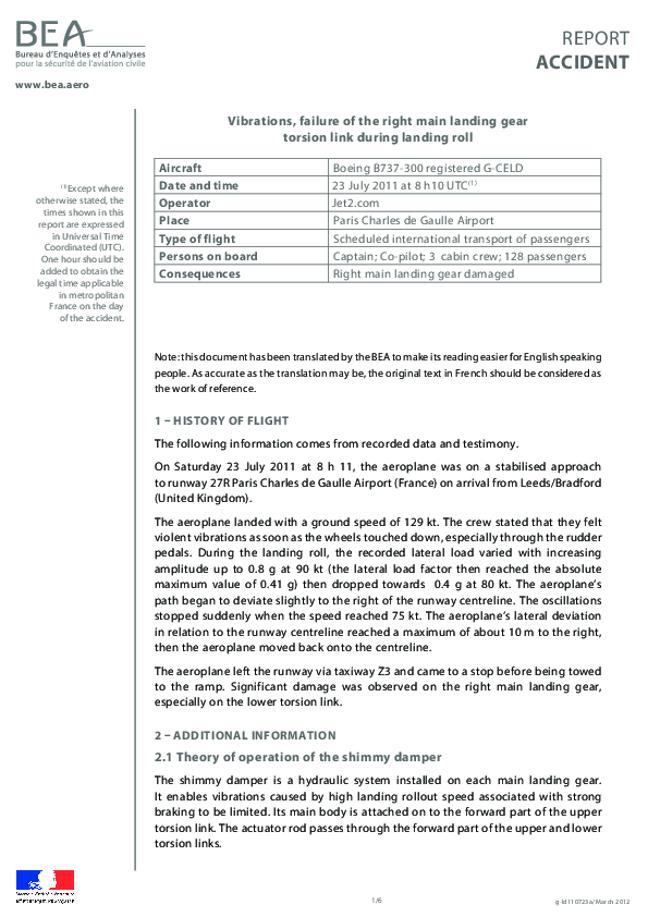 On 23 July 2011, a Boeing 737-300 being operated by Jet2.com on a passenger flight from Leeds/Bradford to Paris CDG experienced violent vibration from the main landing gear at touch down in normal day visibility on runway 27R at a normal speed off a stabilised approach. This vibration was accompanied by lateral acceleration that made directional control difficult but the aircraft was kept on the runway and at a speed of 75 knots, the vibrations abruptly stopped. Once clear of the runway, the aircraft was stopped and the engines shutdown prior to a tow to the gate. None of the 133 occupants were injured.