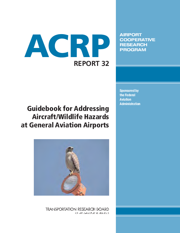 ACRP Report 32: Guidebook for Addressing Aircraft/Wildlife Hazards at General Aviation Airports presents the different wildlife challenges that airports may face and the techniques and strategies for addressing them. The Guidebook discusses for airport mangers and other airport personnel at general aviation airports with limited resources (1) the different species that can be found at airports and specific information that will be helpful in identifying and controlling them, (2) the various wildlife attractants and best management practices that can be employed by airport operators to minimize wildlife activity at and around airports, (3) wildlife control strategies and techniques that are most appropriate at general aviation airports, and (4) how to develop a wildlife control program.