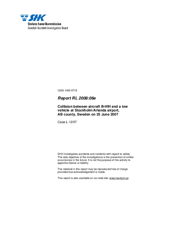 AIB - Report RL 2008:06e, B742 collision with tow vehicle, Stockholm Arlanda, 25 June 2007