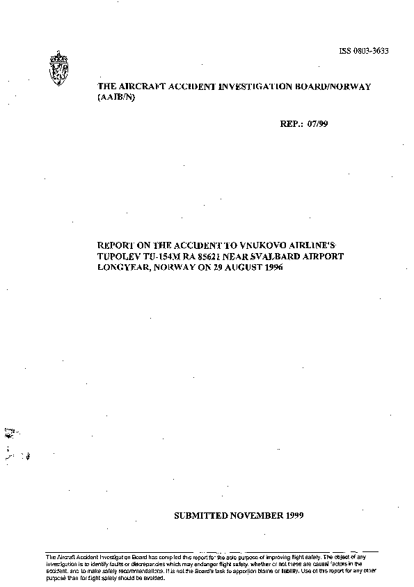 AIBN - Accident Report 07/99 Svalbard Tu154 CFIT, 29 Aug 1996