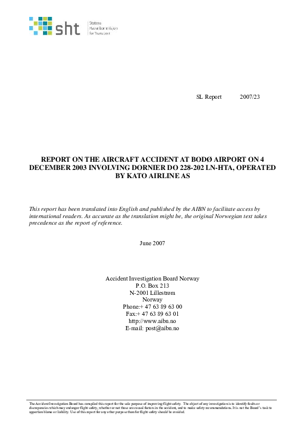 REPORT ON THE AIRCRAFT ACCIDENT AT BODØ AIRPORT ON 4 DECEMBER 2003 INVOLVING DORNIER DO 228-202 LN-HTA, OPERATED BY KATO AIRLINE