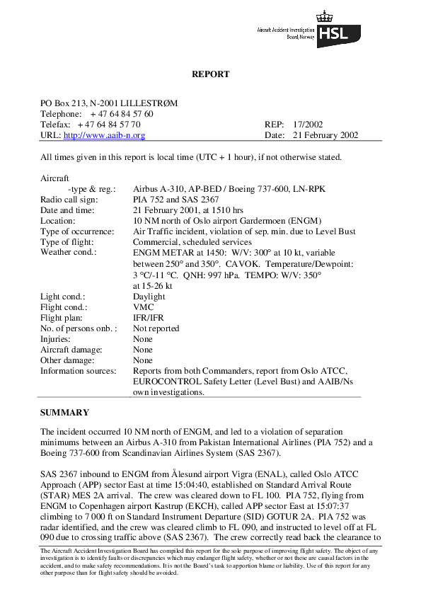 on 21 February 2001, a level bust involving a PIA A310 led to loss of separation with a SAS B737 with apparently uncoordinated TCAS RA near Oslo.