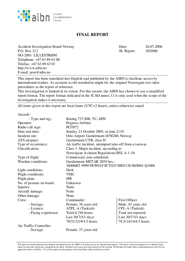 AIBN - Report SL 20/2006 on the Serious Incident attempted take-off from a taxiway Oslo Gardermoen