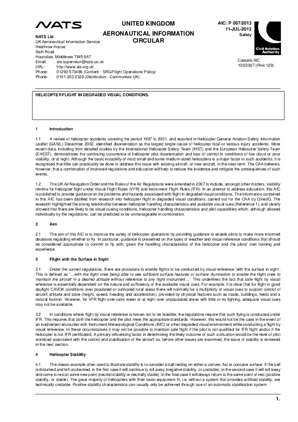 The aim of this AIC is to improve the safety of helicopter operations by providing guidance to enable pilots to make more informed decisions regarding whether to fly. In particular, guidance is presented on the types of weather and visual reference conditions that should be considered appropriate to commit to fly with, given the handling characteristics of the helicopter and the pilots' own training and experience.