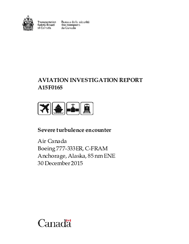 On 30 December 2015, a Boeing 777-300 making an eastbound Pacific crossing en-route to Toronto encountered forecast moderate to severe clear air turbulence associated with a jet stream over mountainous terrain. Some passengers remained unsecured and were injured, one seriously and the flight diverted to Calgary. The Investigation found that crew action had mitigated the injury risk but that more could have been achieved. It was also found that the pilots had not been in possession of all relevant information and that failure of part of the air conditioning system during the turbulence was due to an improperly installed clamp.