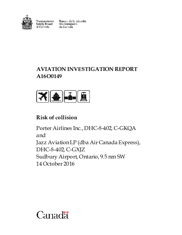 On 14 October 2016, two Bombardier DHC8-400s received coordinated TCAS RAs as they came into opposite direction conflict near Sudbury, an uncontrolled airport, as one was descending inbound and emerging from an overcast layer and the other was level just below that layer after departing. Both aircraft crews ignored their RAs and their respective visual manoeuvring brought them to within 0.4nm at the same altitude. The Investigation noted that the conflict had occurred in Class ‘E airspace after the departing aircraft had cancelled IFR to avoid a departure delay attributable to the inbound IFR aircraft.