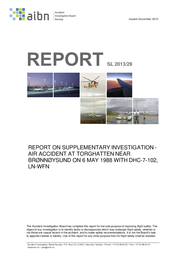 On 16 December 2013, the Norwegian AIB (SHT) published a report of a supplementary investigation into a CFIT accident to a Wideroe DHC7 aircraft which occurred on a non precision approach to Brønnøysund Norway in IMC during a domestic flight in 1988 in which the aircraft was destroyed and all occupants killed. This report was made available in English translation on 24 January 2014. The purpose of the supplementary investigation reported, which was prompted by queries raised during 2013, was to investigate the chances that mobile phone use had affected aircraft systems in any way that might have contributed to the premature descent which had occurred. It was concluded that the presence and possible use of the mobile phones known to have been on board the aircraft had not led to interference from these devices which would have been capable of influencing the course of events.