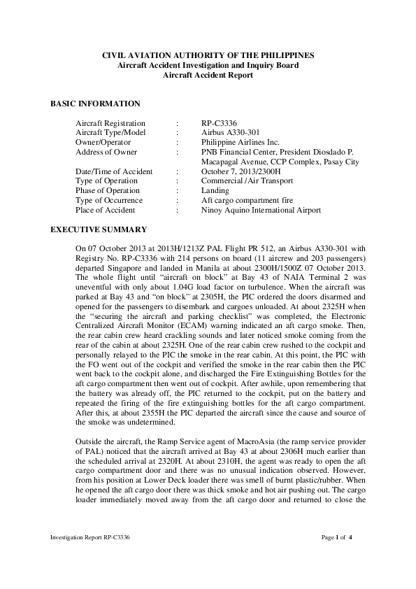 Aircraft Accident Report A333 (RP-C3336) Manila Philippines 7 Oct 2014 Cargo Fire