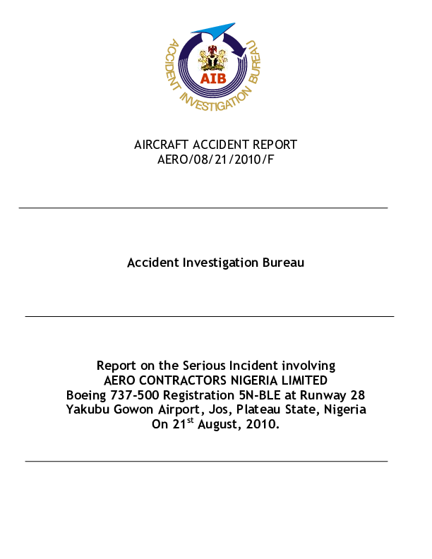 Report on the Serious Incident involving AERO CONTRACTORS NIGERIA LIMITED Boeing 737-500 Registration 5N-BLE at Runway 28 Yakubu Gowon Airport, Jos, Plateau State, Nigeria On 21st August, 2010.