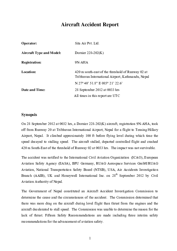 Aircraft Accident Report, D228, vicinity Kathmandu Nepal, 28 Sept 2012