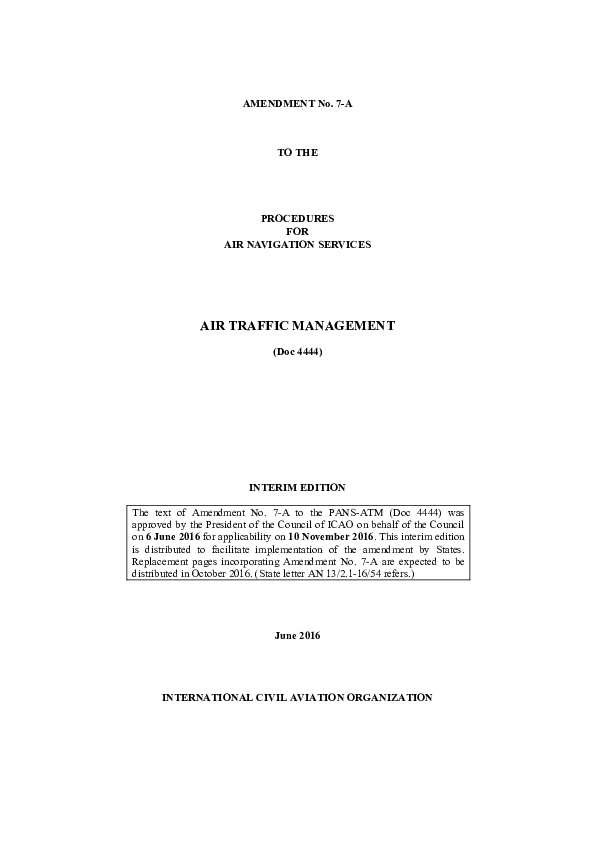 Amendment 7 to the fifteenth edition of the Procedures for Air Navigation Services - Air Traffic Management (PANS-ATM, Doc 4444), for applicability on 10 November 2016.