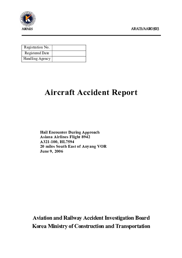 On 9 June 2006, an Airbus 321-100, operated by Asiana Airlines, encountered a thunderstorm accompanied by Hail around 20 miles southeast of Anyang VOR at an altitude of 11,500 ft, while descending for an approach to Gimpo Airport. The radome was detached and the cockpit windshield was cracked due to impact with Hail.