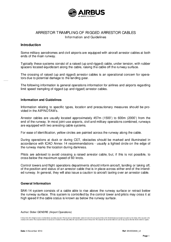 Arrestor trampling of rigged arrestor cables - Airbus Advisory Note (2013)