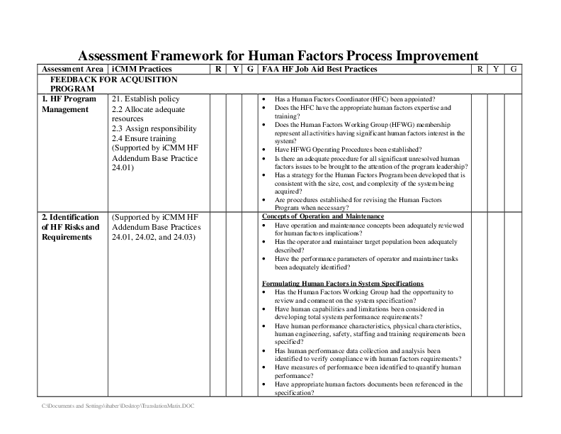 This is an unattributed Assessment Framework for Human Factors Process Improvement which originates from the FAA website: http://www.hf.faa.gov/docs/508/docs/TranslationMatix.pdf