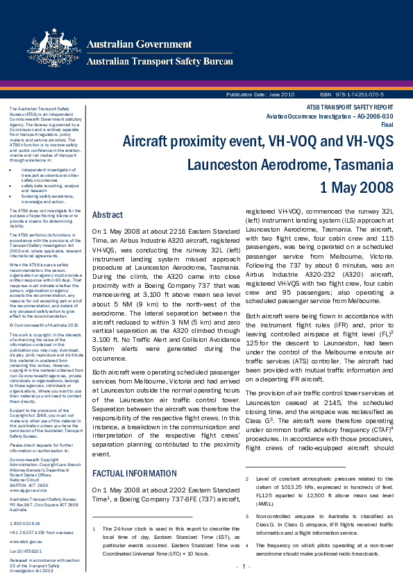ATSB - Aviation Occurrence Investigation – AO-2008-030, Loss of separation A320 and B738, Launceston