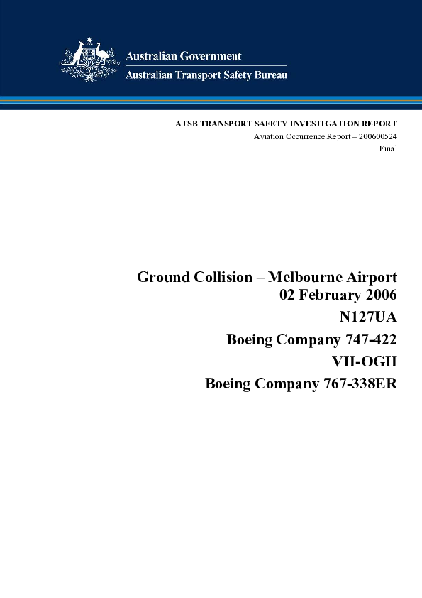On 2 February 2006, a Boeing 747-422 was taxiing during for a daytime departure at Melbourne Airport. At the same time, a Boeing 767-338ER aircraft was stationary on taxiway Echo and waiting in line to depart from runway 16. The left wing tip of the Boeing 747 collided with the right horizontal stabiliser of the Boeing 767 as the first aircraft passed behind. Both aircraft were on scheduled passenger services from Melbourne to Sydney. No one was injured during the incident.