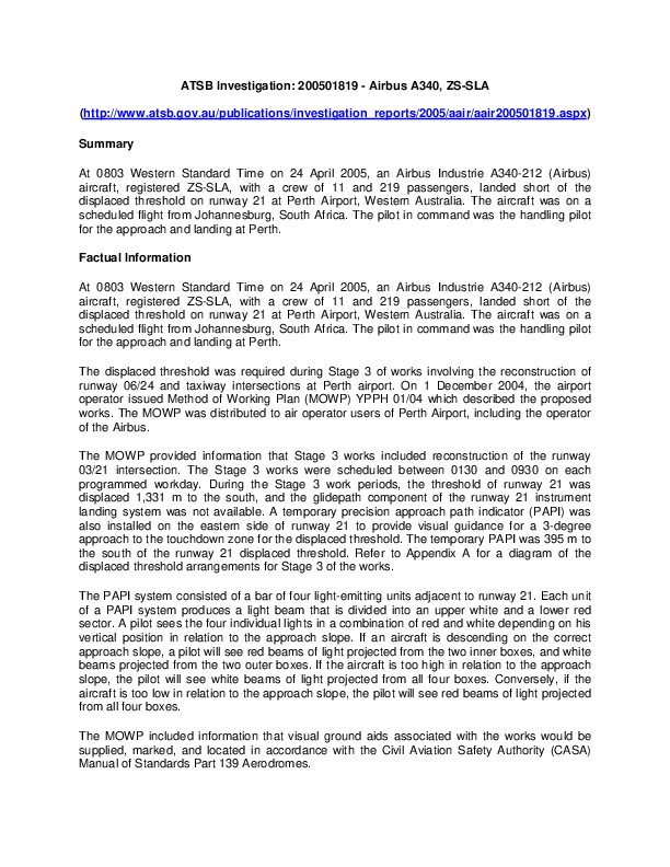 On 24 April 2005, an Airbus A340-200 landed short of the temporarily displaced runway threshold at Perth in good daylight visibility despite their prior awareness that there was such a displacement. The Investigation concluded that the crew had failed to correctly identify the applicable threshold markings because the markings provided were insufficiently clear to them and probably also because of the inappropriately low intensity setting of the temporary PAPI. No other Serious Incidents were reported during the same period of runway works.