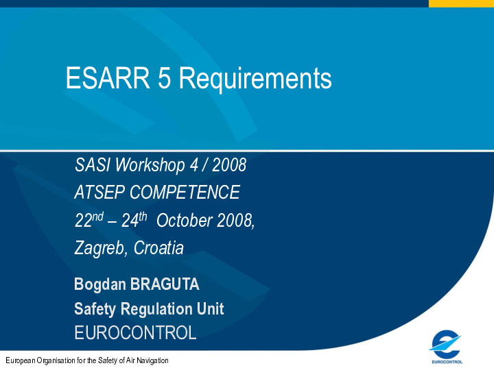 This presentation contains informations related to ESARR 5 requirements: take-aways from ESARR 5, ESARR 5 applicability, the objectives, the requirements: what is competence?, requirements for ATSEPs, consistency with other legislation( ICAO, EC).